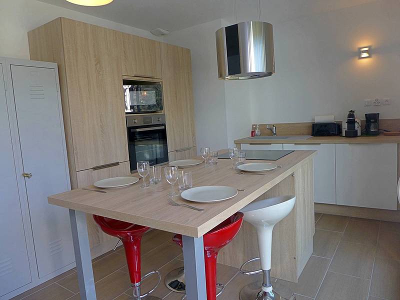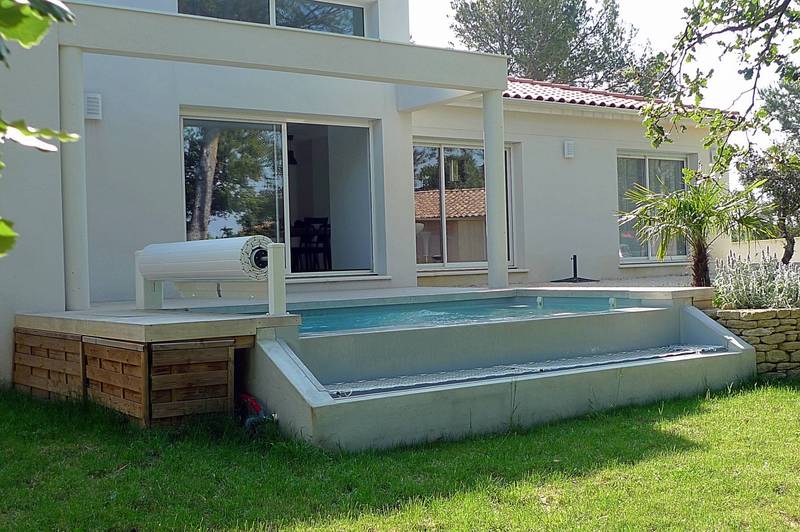 Dans une petite copropriété, maison de plain pied avec piscine et jardin