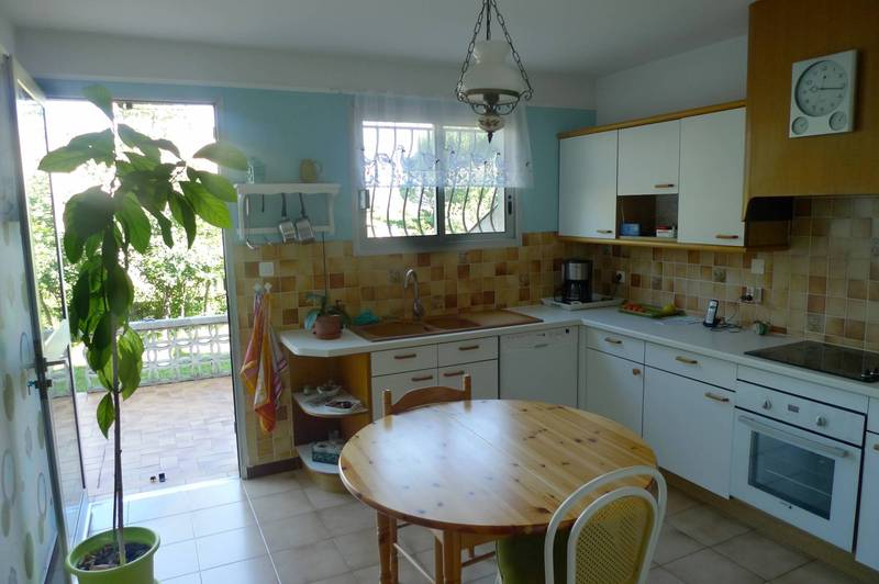 Elle se compose d'un salon avec cheminée à insert, salle à manger, cuisine ouvrant sur une terrasse à l'Ouest, arrière cuis (buanderie/cellier). Toujours au même niveau, 2 chambres, une salle de bains avec douche, WC. Au Sud, une terrasse couverte ombragée de verdure. A l'étage, 2 chambres mansardées, une salle de jeux et une pièce pouvant devenir une salle de bains. Petit cabanon en pierres. Garage. Dans un quartier proche du centre ville, au calme. cette villa des années 80 est habitable de suite.