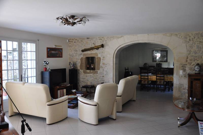 De plain pied, s'ouvrant sur la terrasse couverte on découvre : une cuisine équipée en bois de poirier, un vaste salon/salle à manger d'environ 80m². Un salon TV avec cheminée à insert et, le bureau avec cheminée. A l'arrière: WC, cellier / buanderie, garage (3 voitures), chaufferie.