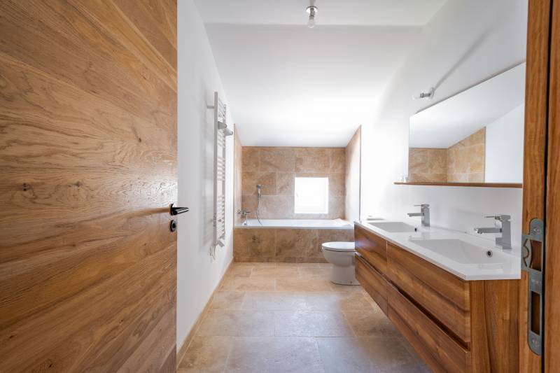A l'étage, 3 chambres avec chacune un dressing ( 17.1m²-12.6m²-16.4m²), une salle de bains avec double vasque de 8.2m², baignoire et wc.