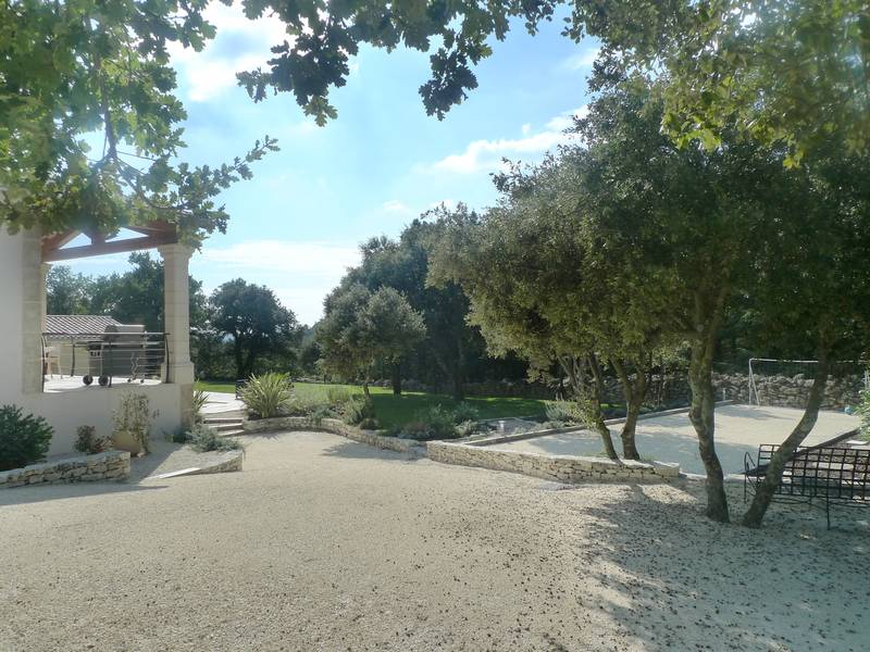 Terrain paysagé de 2360m² avec espace piscine de 9.5x3.75m (chauffée, local technique avec WC et douche d'été), jacuzzi, boulodrome, garage, parking, spacieux sous-sol.