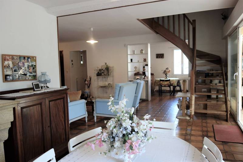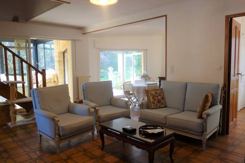 On entre dans le séjour /salon de 40m² avec cheminée ouverte. De grandes baies vitrées donnent accès à la terrasse et à la véranda de 17m² chauffée. L'espace est confortable et lumineux.
