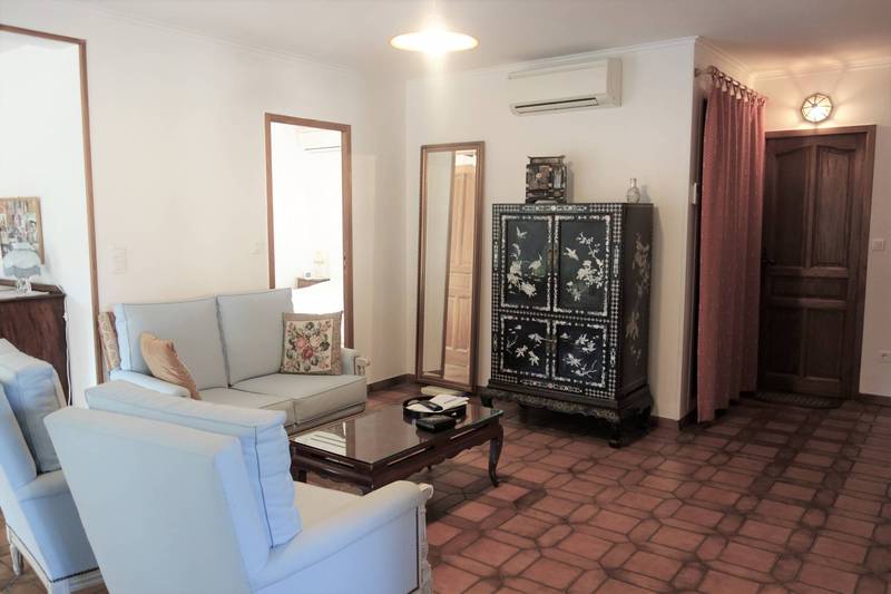 Une cuisine équipée de 15m² semi ouverte sur le séjour avec une porte d'accès donnant sur la véranda. Au même niveau, une chambre avec placard et salle d'eau privative. Un cellier climatisé et toilettes invités.