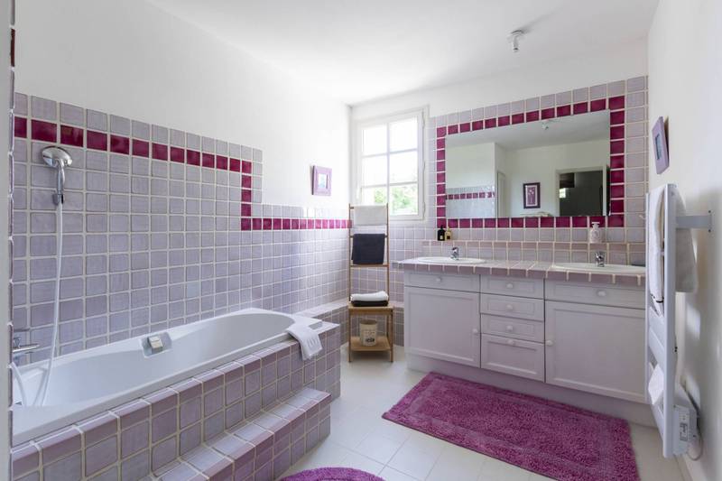 A l’étage, deux belles chambres de 12m² et 14m² avec placards, se partagent une salle de bain de 10m² avec baignoire et double vasque. Grands placards de rangement avec miroirs. Dressing indépendant.