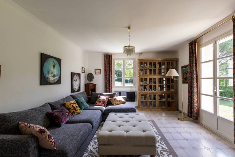 Le hall dessert également le salon cosy de 20m² ouvert sur la terrasse. En retrait, une chambre de 12m² avec sa porte fenêtre donnant directement dans le jardin.