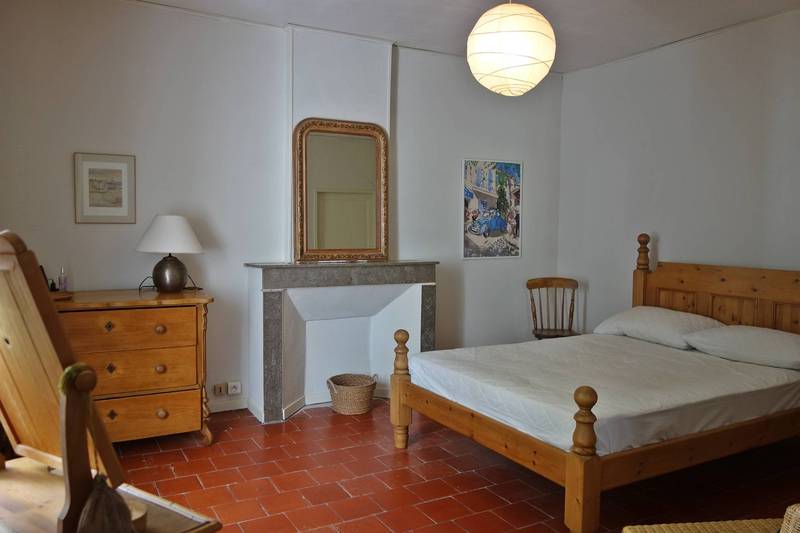 Dans l’entrée, un escalier recouvert de dalle en terrazzo, avec sa rambarde en fer forgé, permet de montée vers l’espace nuit. Un premier palier isole une salle de bain, un WC ainsi qu’une chambre d’appoint, sous toiture. Puis un second, avec sa fenêtre centrée sur la façade, réparti deux chambres d’env 25m². L’une au sol en fibres naturelles tressées, l’autre aux carreaux de terre cuite, complétée d’une cheminée décorative. Les deux inondées de clarté.