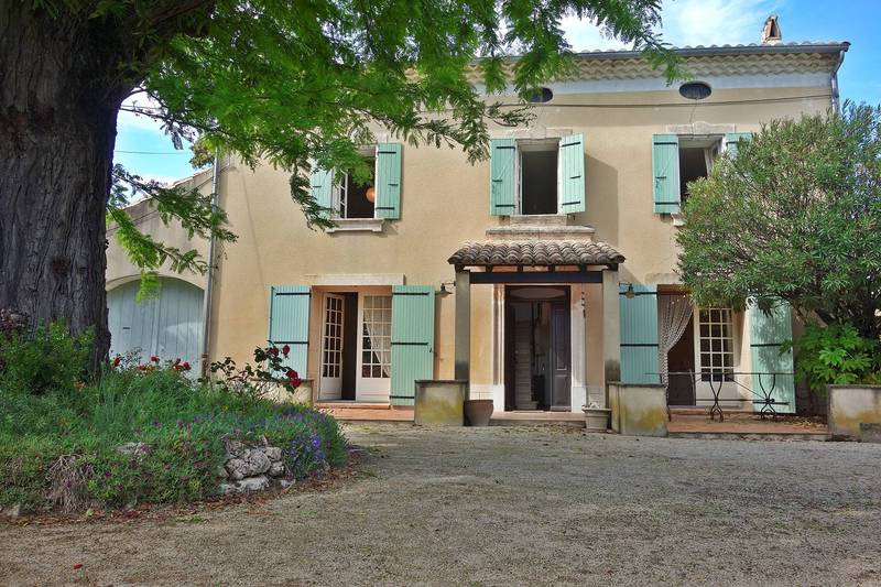 D’abord par ses extérieurs, ou nous entrons dans un espace clos par un large portail. Une fois franchi, celui-ci laisse découvrir une vaste cour, arborée et surtout agréablement ombragée. Le regard est tout de suite attiré par la haute façade Sud, à la porte d’entrée centrale couverte d’un auvent, et au rythme régulier de ses fenêtres, œils de bœuf qui caractérisent cette propriété.