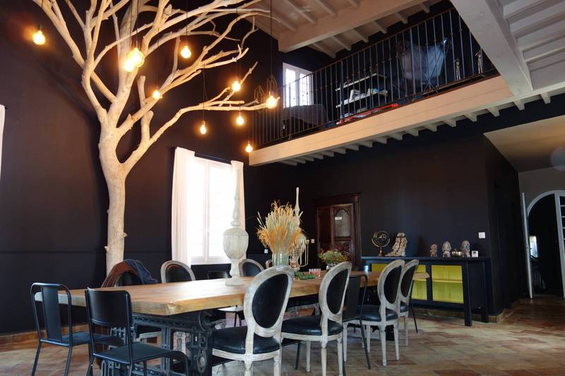 Dans ce bel espace de vie, un majestueux arbre en bois flotté profite de la belle hauteur de plafond pour déployer ses branches . De grandes portes vitrées ouvrent sur un salon TV lumineux de 28m² avec une cheminée à insert.
