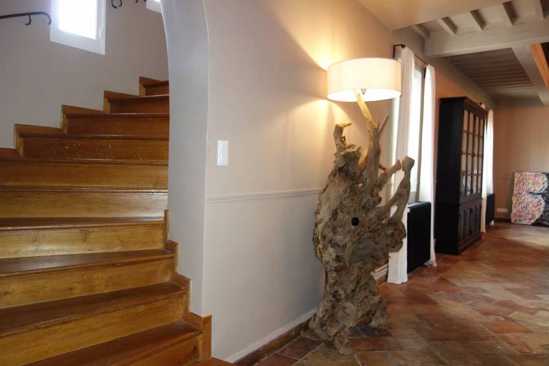 On entre côté rue par un hall d'accueil en ogive. A ce niveau, une grande suite parentale de 60m² comprenant un espace salon/TV, une chambre, un dressing et une salle d'eau privative. La suite parentale s'ouvre sur la terrasse SUD à l'abri d'une tonnelle.
