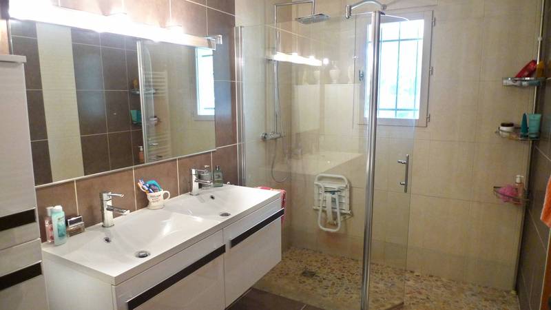 De plain-pied, une entrée couverte de 5,30m² permet d'ouvrir la maison en toute tranquillité. Une belle pièce de vie salon/salle à manger de 35,50m² avec climatisation réversible, cheminée avec insert de avec portes fenêtre ouvrant sur la terrasse couverte et le jardin au Sud, cuisine équipée avec porte ouvrant sur jardin. Le couloir mène aux 2 chambres (9,45 et 12m²). La plus grande avec portes fenêtres donnant sous la véranda. Salle d'eau (douche italienne, 2 vasques), WC, arrière cuisine/buanderie de 17m² lino sur dalle béton). Chaufferie.