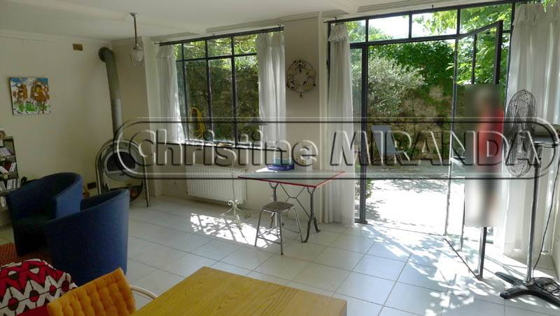 En rez-de-jardin, cuisine équipée, salon, buanderie, WC et local technique, ainsi qu'une grande pièce à vivre qu'éclairent de grandes baies vitrées (façon atelier).