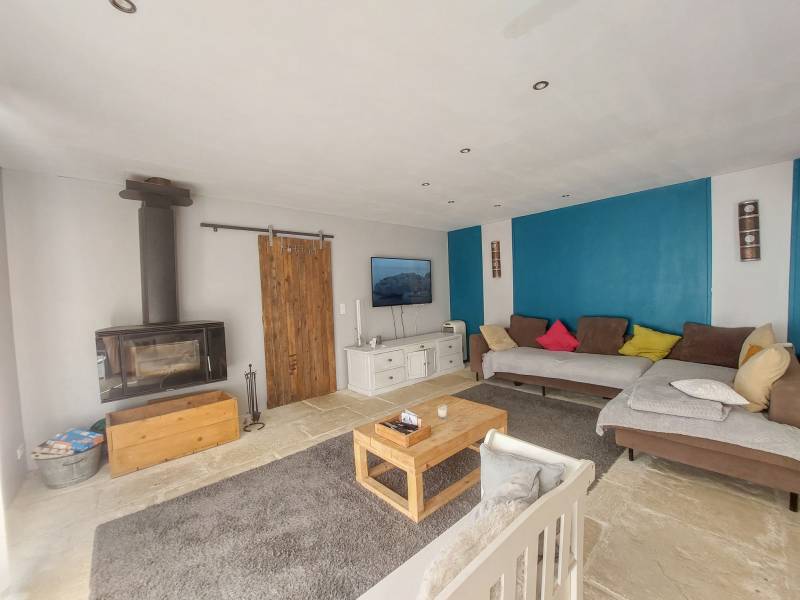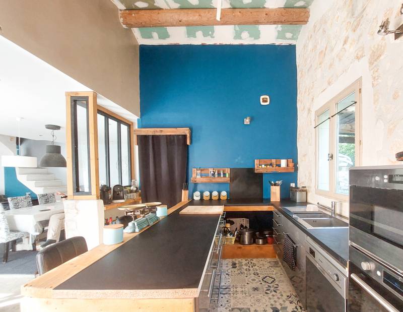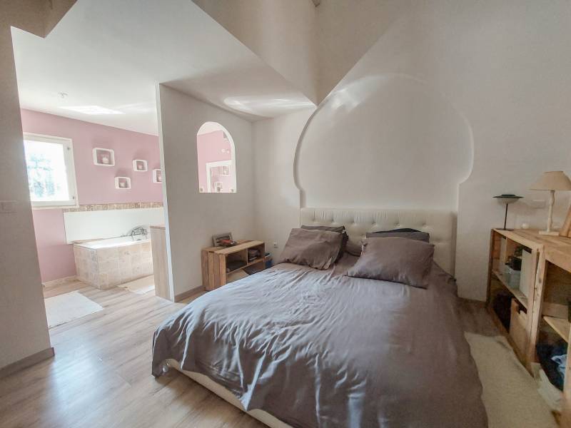 a maison dispose d'un vaste salon / salle à manger, une cuisine semi ouverte et une buanderie, toujours de plain pied une suite parentale avec douche et baignoire, et un espace dressing.