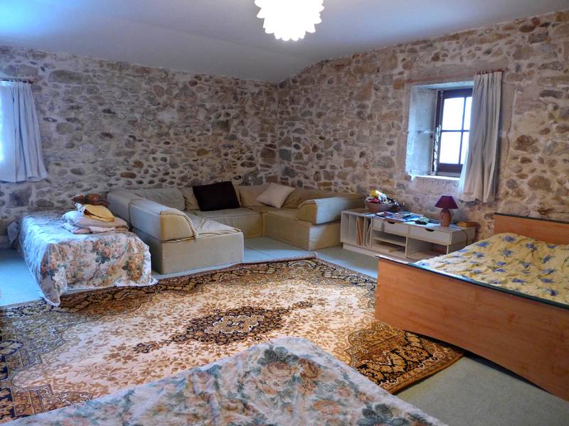 De plain pied: cuisine aménagée, trés agreable salon/salle à manger, 2 chambres, 2 salles d'eau, dressing, kitchenette. A l'arrière de la cuisine, cave voûtée. A l'étage: 2 chambres, 1 dortoir, des greniers aménageables. Si l'on ouvre ces pièces, elles pourraient profiter du terrain au Nord de la maison qui se retrouve au même niveau.