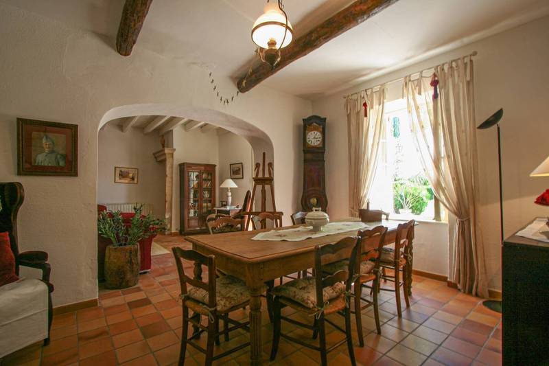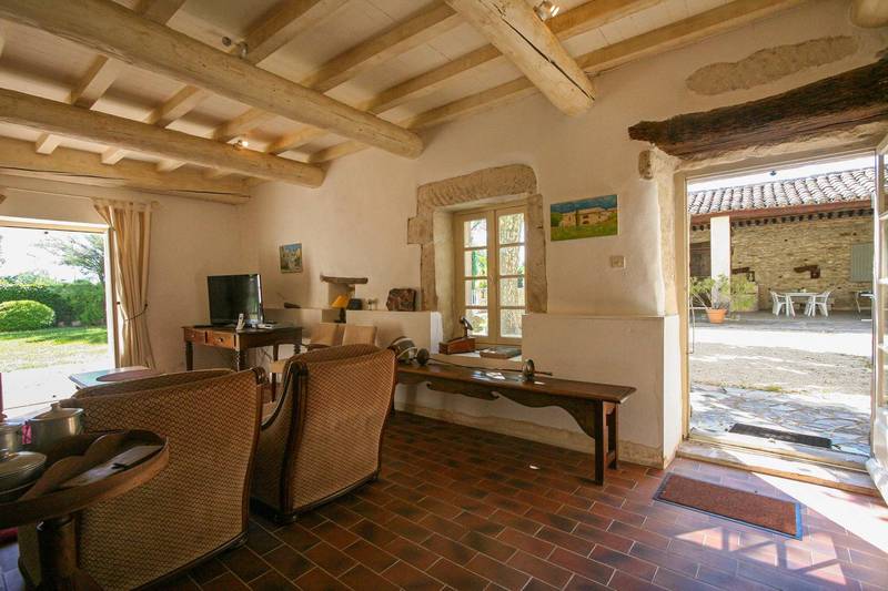 Une salle à manger, 2 salons avec cheminée en pierre. Toutes ces pièces s'ouvrent sur la cour et le jardin .