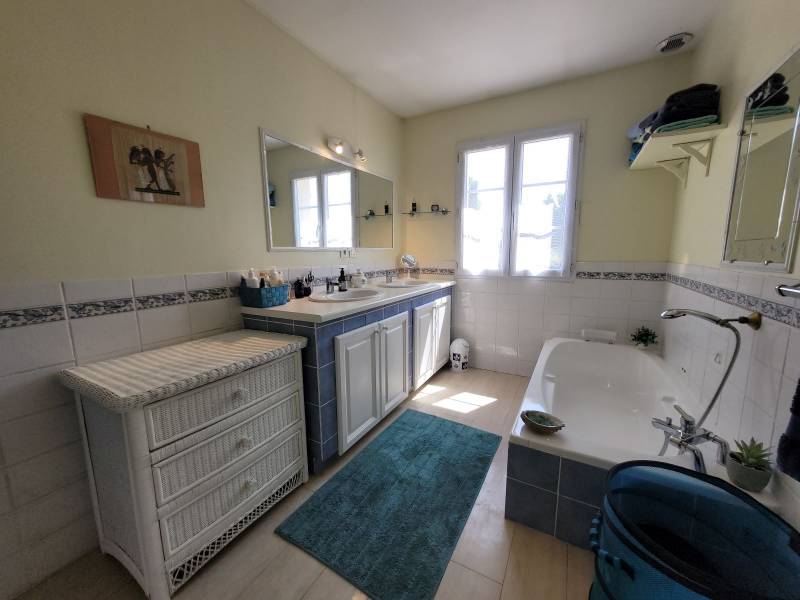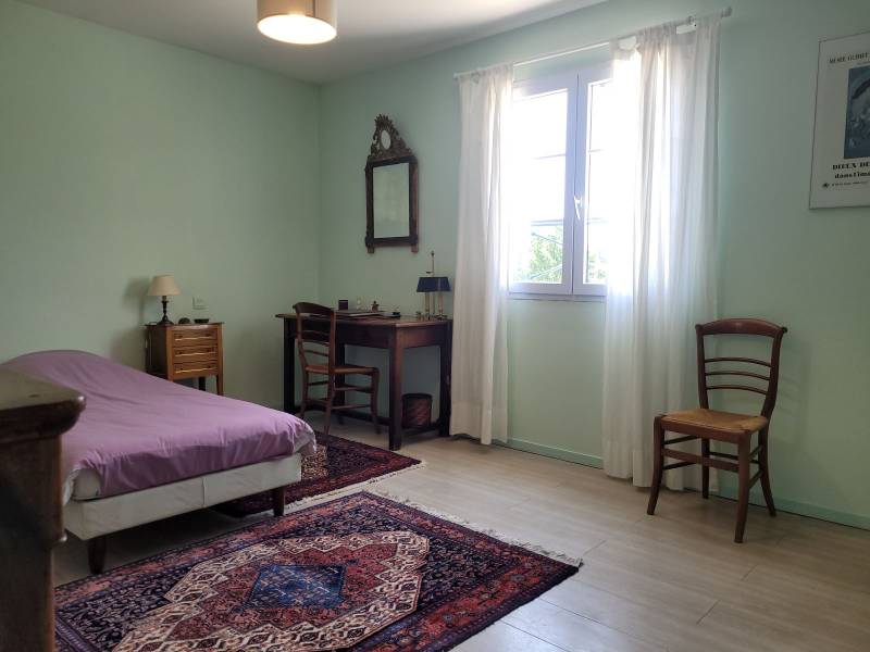 La maison s'organise sur 2 niveaux. Au RDC une cuisine indépendante (16m²) entièrement équipée. Un salon/séjour (35m²) et 2 chambres dont une suite parentale avec salle d'eau. Cellier. A l'étage 3 chambres de 14 m² et une salle de bains. Dressing. Grande terrasse (40m²) Garage double 30m². Chauffage au sol. Maison très agréable et fonctionnelle. La parcelle constructible en bout de terrain permet la réalisation d'un beau projet de construction indépendant.