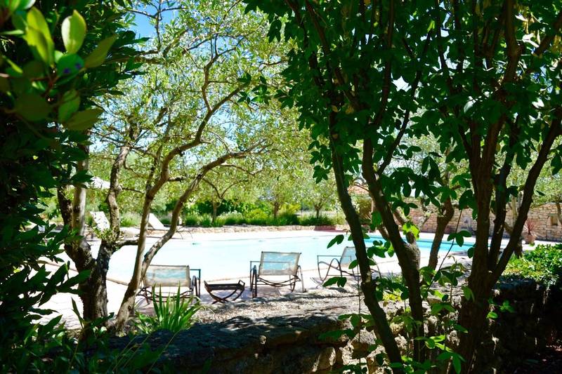 Le terrain paysagé de 6770m² est en grande partie clos. Il se répartit entre : parking aérien, cour intérieure, espace piscine de 15x7m avec local technique et plage dallée, oliveraie et prairie.