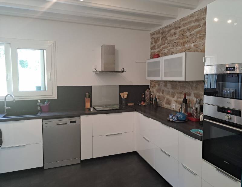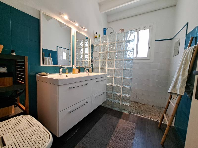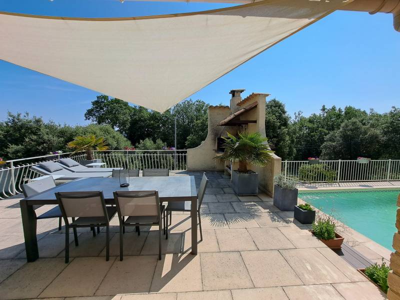 l'extérieur, deux grandes terrasses à l'abri de tout vis à vis bordent la piscine, un terrain de pétanque pour des moments conviviaux, deux potagers et des abords agrémentés d'arbustes, de fleurs et d'arbres, un havre de paix.