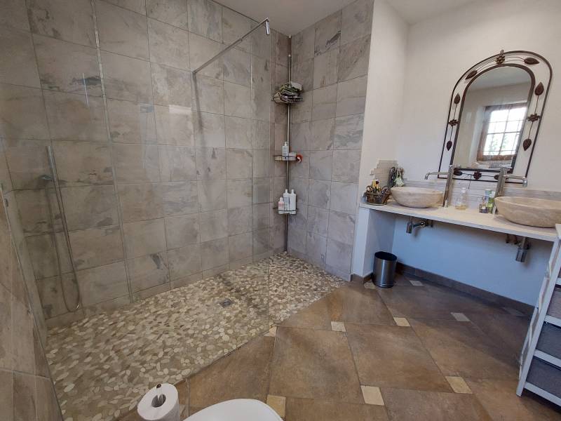 lle dispose d'une spacieuse et lumineuse pièce à vivre ouverte sur terrasse. Cuisine équipée. toujours au rdc, 3 chambres dont 2 suites parentales dont une avec dressing, salle d'eau et wc, l'autre avec sa salle d'eau. Un escalier en bois massif dessert l'étage ouvert pouvant servir de bureau. Une chambre avec wc et arrivées d'eau. Balcon. Double garage, cave. Tout à l'égout. plancher chauffant, adoucisseur. portail automatique....... Entre Vaison la Romaine et Nyons secteur agréable pour sa douceur de vivre....Coup de cœur assuré, à découvrir sans plus tarder.