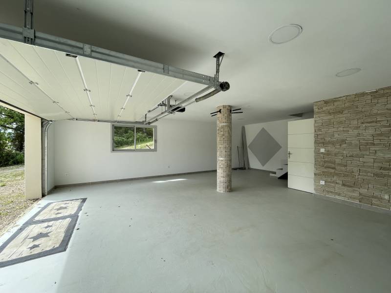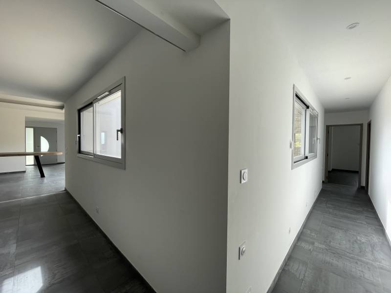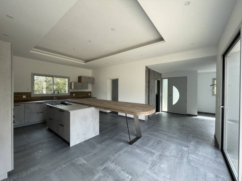 elle villa contemporaine Neuve de 158m² habitables, le tout sur une parcelle de terrain de 2559m² constructible pouvant accueillir un projet de division. Ce bien de plain pied, aux dernières normes RT 2020, se compose d'un hall d'entrée avec coin bureau + wc, une grande et lumineuse cuisine entièrement aménagée et équipée d'environ 30m², une buanderie, un salon séparé de 23m² environ. Pour le coin nuit, vous trouverez un grand dégagement desservant 1 chambre d'environ 26m² + dressing, 1 chambre avec salle d'eau privative de 14m², 1 chambre de 18m², une grande salle d'eau avec douche + baignoire de 13m², un wc. En sous sol un grand garage de 50m² avec une pièce technique. Plancher chauffant et rafraîchissant (PAC air/eau), adoucisseur d'eau. Tout à l'égout. Volet roulant aluminium solaire. Menuiseries double vitrage aluminium. Cette belle propriété très peu énergivore est entièrement terminé pour la partie habitable, les extérieurs sont à prévoir.