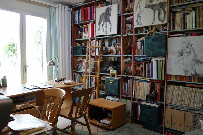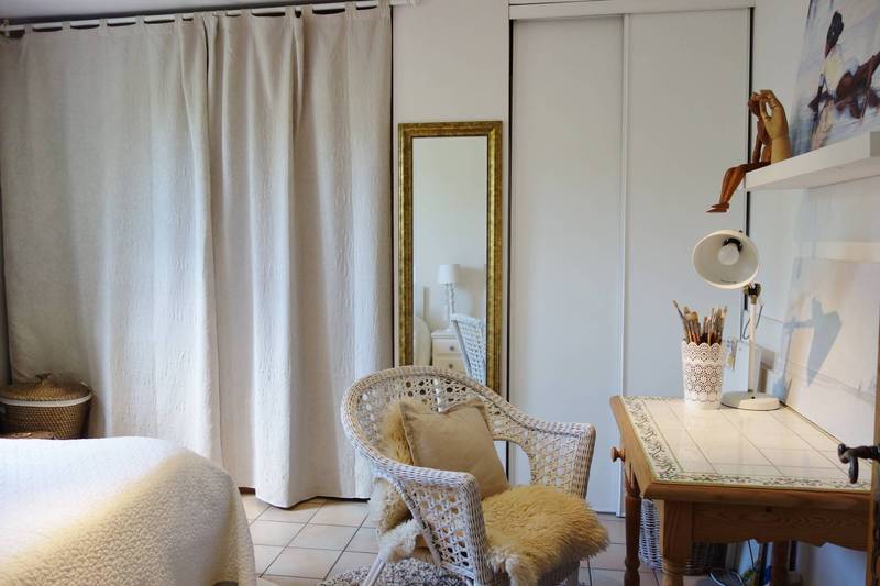 En rez de jardin on découvre une cuisine équipée, indépendante de 13m² donnant sur une terrasse au SUD semi couverte. Le salon/séjour de 34m² comprend deux portes fenetres ouvrant sur le jardin coté SUD et sur une autre terrasse au NORD ou l'on peut profiter de la fraicheur ombragée en période estivale. La pièce de vie est équipée d'une cheminée à foyer ouvert. Attenant au séjour, une chambre/ bureau avec porte fenêtre permettant d'accéder directement au jardin. Une salle d'eau et WC.
