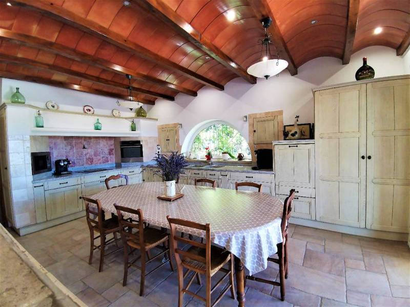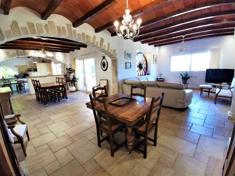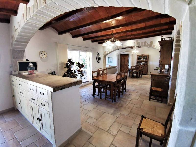 Chauffage au sol géothermie et/ou pompe à chaleur Adoucisseur. Un forage permettant d'alimenter la maison et d'arroser le jardin. portails automatiques. Portes de garages automatiques. Terrain piscinable. Belles prestations, du charme. Bâtisse Très bien entretenue. A découvrir sans plus tarder... Cette bâtisse comprend au niveau de la partie principale : Une belle pièce de vie avec en enfilade une cuisine équipée avec un accès direct à la terrasse couverte orientée plein Sud, une salle à manger, et un salon. Un couloir distribue l'espace nuit, 3 spacieuses chambres avec placards aménagée et wc indépendant. Une porte au niveau de la cuisine permet d 'accéder directement à une arrière cuisine et sous sol. Celui-ci complétement aménagé et carrelé. On trouve, une chaufferie, une vraie cave creusée dans la roche. Un double garage. Sans oublier un appartement indépendant composé d'un séjour avec cuisine équipée, 2 chambres et une salle d'eau avec wc. Cuisine d'été et boulodrome.
