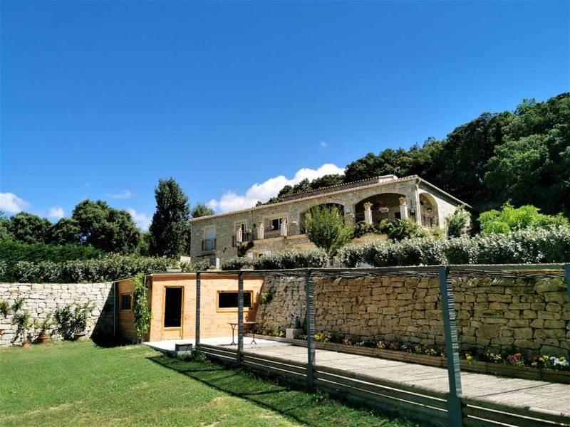 Cette bâtisse comprend au niveau de la partie principale : Une belle pièce de vie avec en enfilade une cuisine équipée avec un accès direct à la terrasse couverte orientée plein Sud, une salle à manger, et un salon. Un couloir distribue l'espace nuit, 3 spacieuses chambres avec placards aménagée et wc indépendant. Une porte au niveau de la cuisine permet d 'accéder directement à une arrière cuisine et sous sol. Celui-ci complétement aménagé et carrelé. On trouve, une chaufferie, une vraie cave creusée dans la roche. Un double garage. Sans oublier un appartement indépendant composé d'un séjour avec cuisine équipée, 2 chambres et une salle d'eau avec wc. Cuisine d'été et boulodrome.