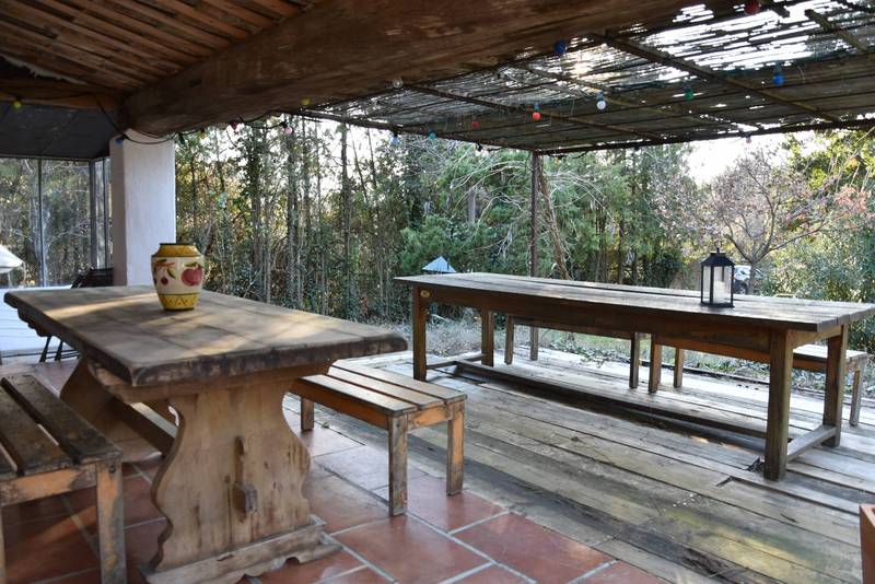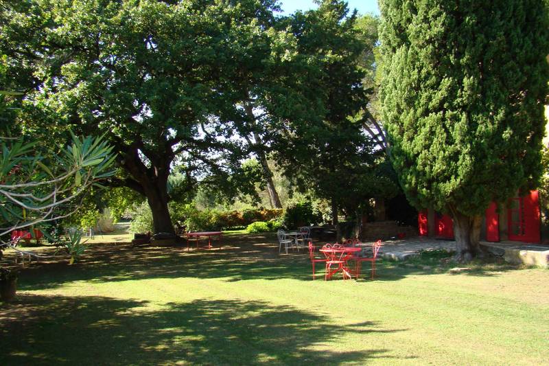 La propriété est entièrement clos, on y laisse volontairement une ouverture au sud afin de prolonger le regard sur la nature environnante et une ouverture au nord. L’ensemble de la propriété est aménagé de manière à y trouver différents espaces distincts. Le chêne invite tout naturellement à y trouver une grande table ou plusieurs petites afin de tous se retrouver sous son ombre.