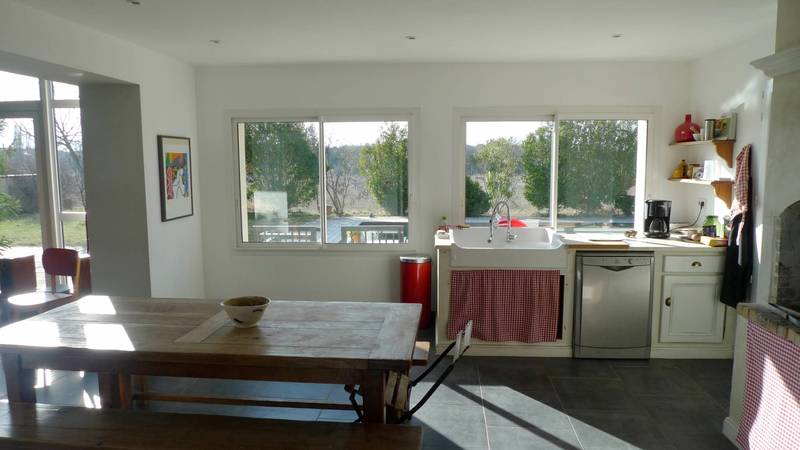 En rez de chaussé la cuisine ouverte aménagée d’une petite cheminée, donne sur la piscine au sud.
