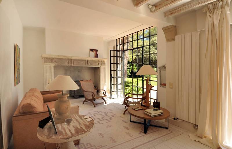 Toujours au rdc, Une deuxième chambre avec salle de bain donnant sur le patio plein sud . Un autre salon, salle à manger avec cheminée d'époque,murs revêtus de pierre, plafond avec voûte, porte boiserie, portes vitrées coulissantes donnant sur le parc et la piscine.