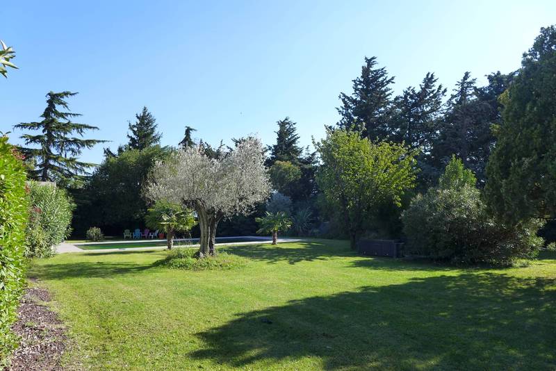 Terrain clos, arboré et paysagé de 5300m² avec piscine, cuisine d'été et garage double.