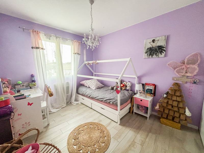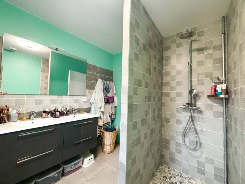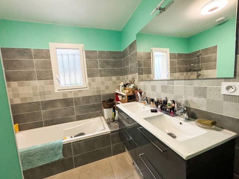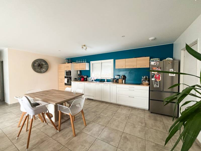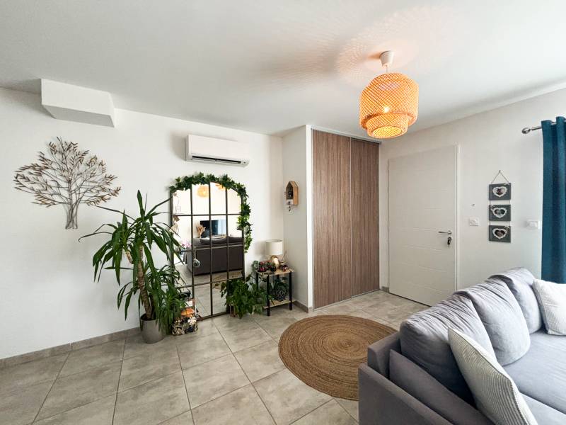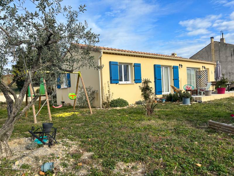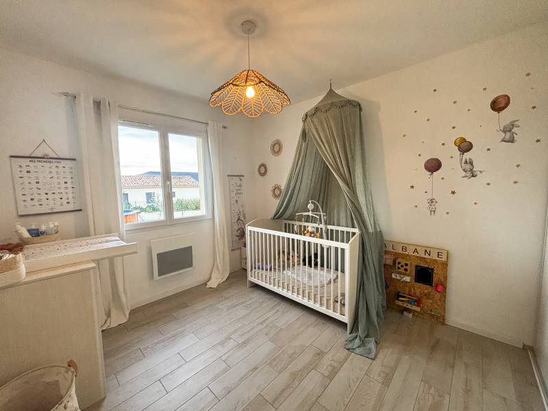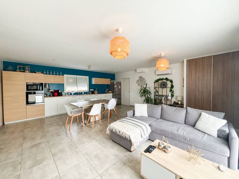 'agence Christine Miranda Immobilier vous propose à la vente, une très jolie villa de plain pied d'environ 87m² sur une parcelle d'environ 712m². La villa dispose d'une entrée avec placard, une pièce de vie très spacieuse et lumineuse, avec cuisine ouverte aménagée, donnant directement accès à la terrasse plein sud. Un coin nuit composé de 3 chambres avec placard dont une avec accès à la terrasse, une salle de bain complète avec baignoire, douche et double vasque, un wc séparé. Egalement une buanderie, et un garage avec mezzanine.