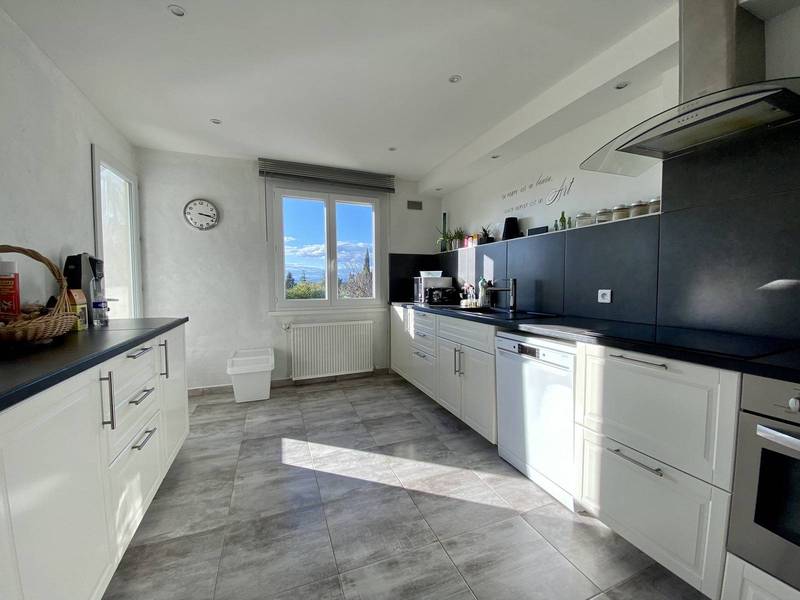 L'étage offre une cuisine semi-ouverte, équipée et aménagée de 13m² se prolongeant sur un balcon filant et communiquant avec le salon de 17m². L'espace repas de 10m² est agrémenté d'une cheminée avec insert. Une pièce d'eau avec douche Italienne et 2 vasques, pour les deux chambres de l'étage.