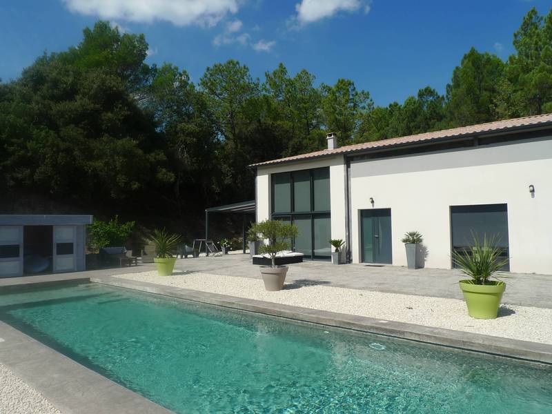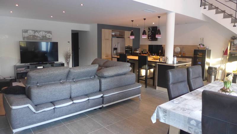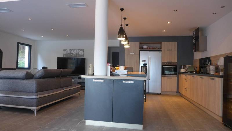 Construite en 2015, la Villa s'ouvre sur un grand volume de vie avec une belle hauteur sous plafond : Salon, salle à manger et cuisine bien équipée.