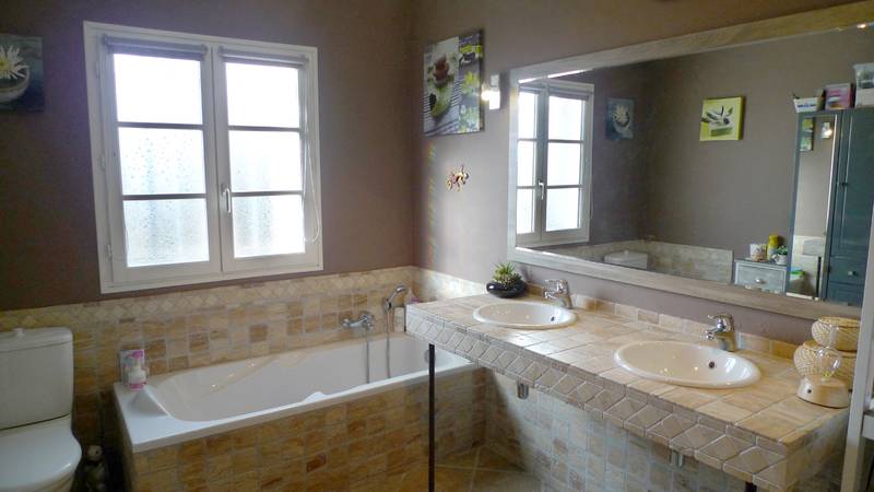 Sur 2 niveaux, elle developpe 220m². On trouve: cuisine provençale en partie équipée, superbe salon avec cheminée/salle à manger de 56m² ouvrant sur le jardin, la chambre parentale avec dressing et salle de bains complète, 1 chambre, 1 bureau, WC. A l'étage: 4 chambres (15, 15, 15.40, 19m²), salle de bains avec douche, WC. Sols identiques de partout ton "pierre". Prestations de qualité.