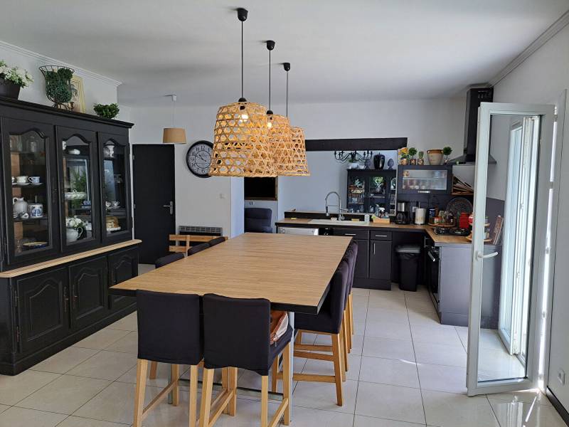 'agence Christine Miranda vous présente une maison de plain pied de 125 m2 à proximité des commodités (boulangerie, boucherie, primeur...). La maison se compose de plusieurs espaces de vie avec une décoration stylée et exposés au sud : une grande cuisine ouverte avec îlot central pouvant accueillir 8 personnes, un salon dans le prolongement et un peu en retrait le coin TV et sa cheminée à l'éthanol pour une ambiance cosy. Un escalier permet d'accéder à la 4ème chambre mansardée. L'espace nuit, au RDC, est spacieux avec ses 3 chambres, une SDB et un toilette indépendant. Vous disposez également d'une buanderie avec grand placard.