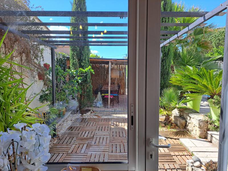 e jardin est entièrement clos et arboré (olivier, cerisier, abricotier, palmier, cyprès...). La piscine 8 x 4 est entourée de terrasses en pierre et en bois, d'une cuisine d'été type paillote, de pergolas, de massifs pour une ambiance zen et estivale.