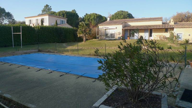 p>Elle profite d'un terrain clos de 1600m² en partie arboré de chênes, avec piscine de 9x4m (coque, alarme). Villa de 1998, de plain pied, Sh110m²: spacieuse pièce de vie de 60m² en "L", regroupant la cuisine équipée, la salle à manger et, l'espace salon avec cheminée. 3 chambres avec placard dans chacune, salle de bains, WC avec lave mains. Terrasse semi couverte avec barbecue, garage. Quartier résidentiel, très calme