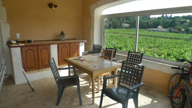 Terrasse orientée plein sud avec cuisine d'été, magnifique vue sur le château et la camapgne environnante.