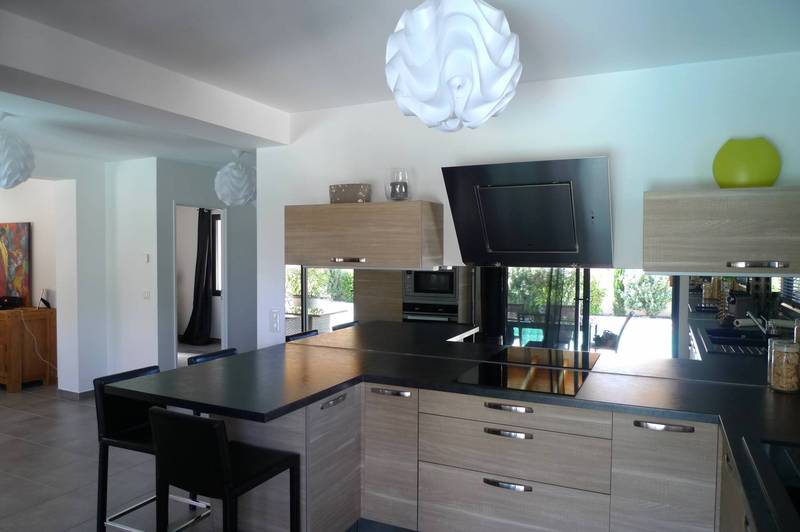 Elle développe 146m² sur 2 niveaux. En rez de jardin, une spacieuse pièce de vie comprenant cuisine équipée, salle à manger et salon. Toujours au même niveau une suite parentale avec sa salle d'eau, cellier et buanderie. De spacieuses baies vitrées permettent de laisser rentrer la lumière et de profiter d'une vue sur le jardin et l'espace piscine. Parmi les prestations figurent un beau jardin clos, paysagé avec piscine chauffée de 4mX8m. Un garage.