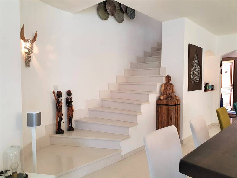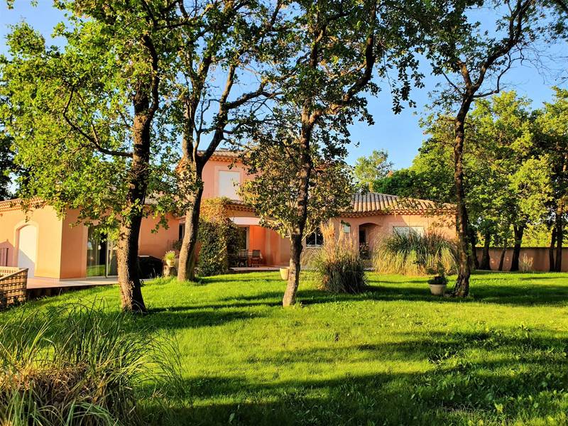 la fois au cœur des vignes et à proximité d’un village de la Drôme provençale, dans un environnement calme avec une vue dégagée, l’équipe de Christine Miranda Immobilier vous présente cette lumineuse villa de 185 m2, construite en 2000. Nous entrons sur le terrain entièrement clos et arboré de 4 800 m2 qui l’entoure, par une grille en fer comme on l’apprécie en Provence. Une allée couverte de chêne nous conduit ensuite à l’espace de stationnement, d’accueil et d’entrée, ingénieusement disposée à l’écart de la façade principale, embrassant le parc. Dès l’entrée disposant de placard, l’appel du volume et de la luminosité de l’espace de vie d’environ 60 m2 nous invite à nous avancer. Il est ouvert sur le parc et une terrasse protégée, par trois baies vitrées coulissantes. On y trouve un espace repas judicieusement séparé par une petite différence de niveau d’un coin salon agrémenté d’une cheminée. Aussi le bel escalier de marbre pour accéder à l’étage. Une grande cuisine équipée, fermée et fonctionnelle, tient sa place sur le côté. Un premier espace privé s’organise avec une suite parentale et son accès extérieur comprenant un dressing de 6 m2, une salle de bain et douche avec double vasque. Également à l’écart de la sphère plus agitée, un bureau cocon de 12 m2. Cellier, buanderie, WC indépendant complètent le rez-de-chaussée. Chaufferie et cave à vin trouvent place au sous-sol. A l’étage, un palier dessert deux chambres de 13 et 14 m2 ouvrant une fois encore sur la verdure environnante, une salle d’eau ainsi qu’un WC séparé.